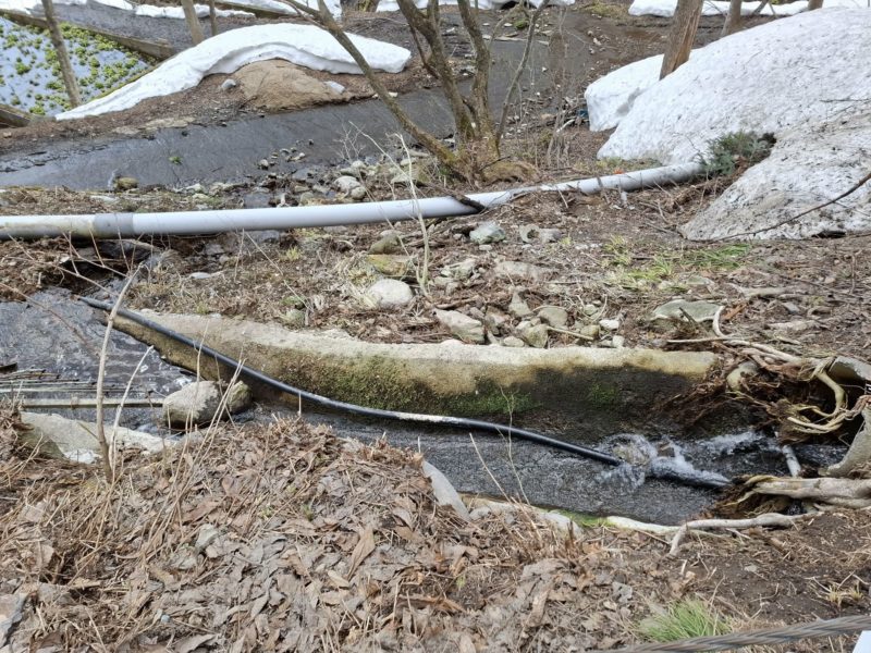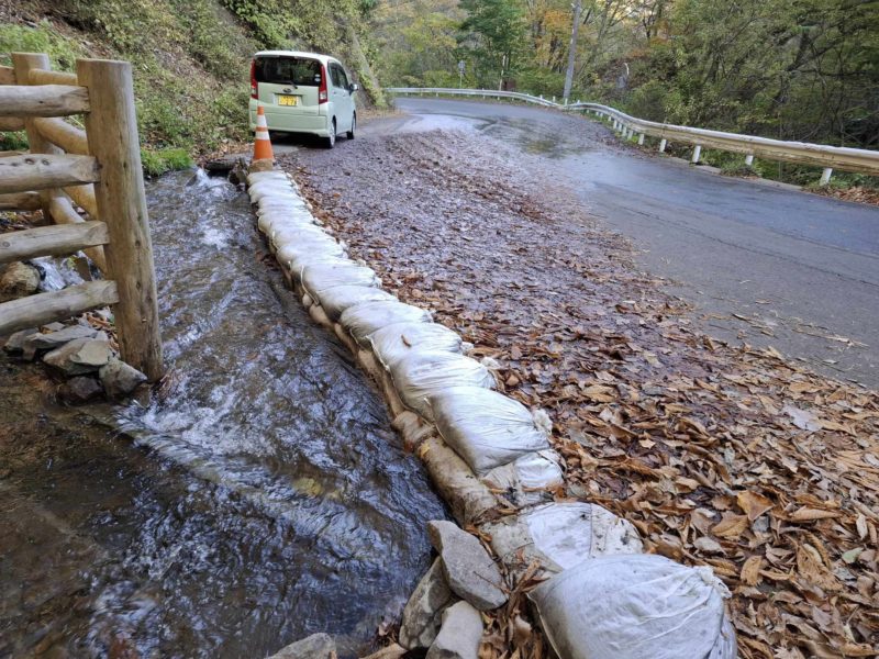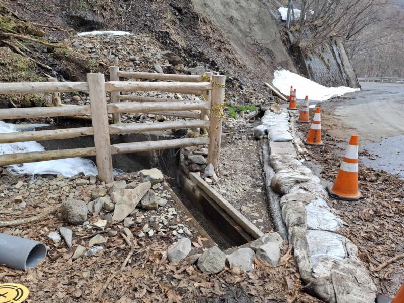 当初、県道沿いの水路からの溢水により、道路やその下方のわさび田へ被害が生じておりました。調査の結果、当該水路は「わさび生産組合」の管理下であったため、当初は県による対応が困難と判断されました。