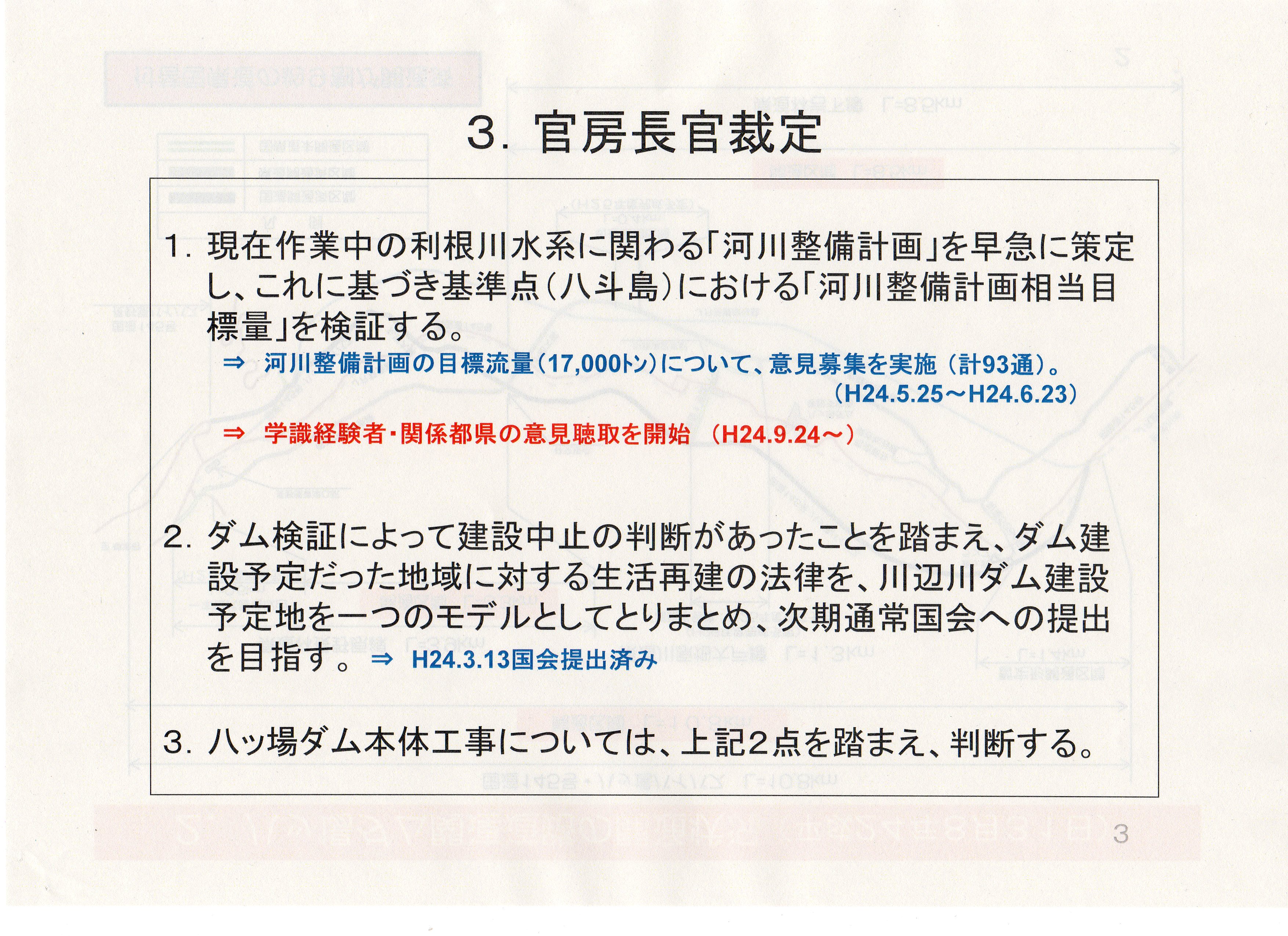 県政 八ッ場ダム 状況報告 2012-09-26 by 金井康夫事務所 八ッ場ダムの現状に関する資料を添付させていただきます。 今後は官房長官裁定によって、決まるものとなっています。 有識者会議5回目が昨日行われたようですが、共通の認識のずれによって、今後さらなる検討を行う予定となっています。 地元住民は半世紀もの間、翻弄されてきています。 特例公債法案もそうですが、そろそろ決める政治を行ってもらいたいものです。 地方が国の政策に翻弄され続け、疲弊しています。 一日も早い決める政治を行うべきであります。 (金井康夫事務所より)